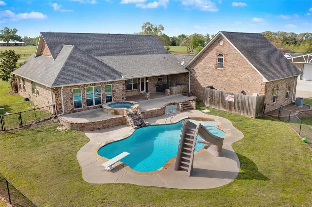Quadruple threat, home, pool, shop & location. Stone crafted custom 4-3 located in desirable Spring Creek neighborhood just outside of Emory TX. Let’s walk through, covered front porch greets, opens to a blend of modern finishes & warm rustic touches. oversized primary, private turn out overlooking pool & woods. Double-sided gas FP, new seamless tile shower & counters, soaking tub with fireplace at your feet. High-end construction, stone FP, well-appointed kitchen, granite, bkfst bar, open to living. Generous rooms, ample storage, formal dining & media room. 3 car attached garage. LET’S SHOP TALK! 40X30 foam insulated steel shop, 3 rollup doors plus walk through, 20ft covered tractor-implement storage. Room for it all. POOLSIDE, YES PLEASE! in ground, updated lights, pumps & sprinkler, full slide, hot tub, open & covered gathering spaces, ceiling fans, fenced & secure. Irrigation system, professionally landscaped, maple, red oak & magnolias. The CROWN NEW ROOF, 2024.